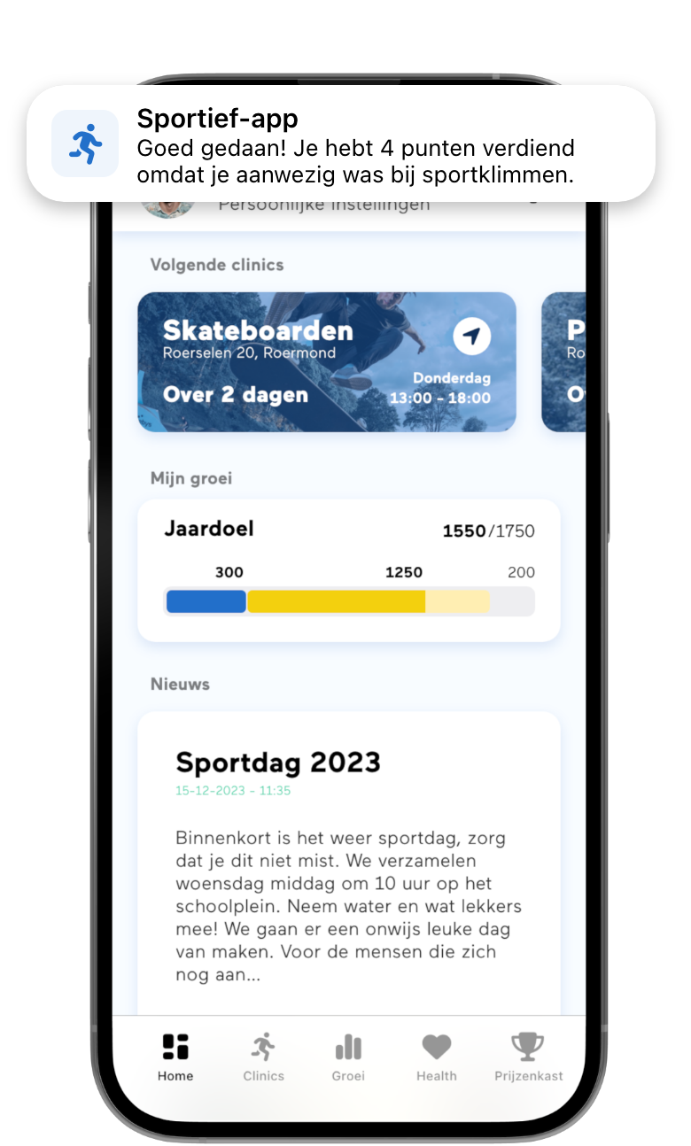 Deel nieuwsberichten en krijg meldingen van je (aankomende) activiteiten en clinics.